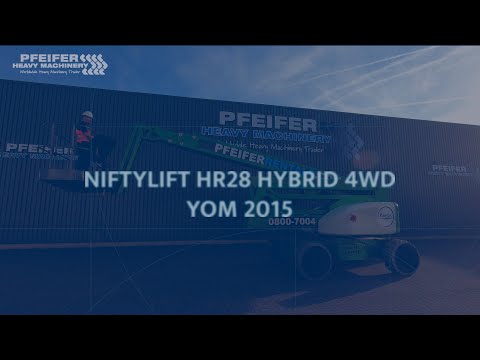 This machine has a valid inspection and can be sold with warranty. Inform about our conditions! This Nifty Lift HR28 is also available for rental. Manufacturer: Niftylift Typ: HR28 HYBRID 4WD Mnuf. year: 2015 Fuel: Hybrid - Battery & Diesel Serial number: 28 27355 Working Hours Battery: 992 h Working Hours Engine: 832 h * Working Height: 28 m * Horizontal reach: 19 m * Loading / lifting capacity: 280 kg * Slew: 360° Continuous. * Fly-Boom Arc: 150°. * Platform Rotation: 180°. * Turning Radius-Outside: 5.9 m * Platform Size: 2.4m x 0.9m * Gradeability: 40% (22°) * Tyres: Non marking (70%) * Engine: (Kubota - 47.5Hp / 35kW) * Travel Speed: 4.7 km/h SAFETY FEATURES * SiOPS * Tilt Alarm * Foam Filled Tyres * Harness Points * CE Mark * Lock Valves on all Hydraulic Cylinders * Automatic Fail-Safe Brakes * Powered Auxiliary Descent * Dual Controls (Platform & Base) Transport size LXWXH: 7.30m x 2.49m x 2.70m CE (Declaration of Conformity) More detailed pictures / product movie on our website. pfeifermachinery.com Above specifications are subject to change without prior notice and subject to errors